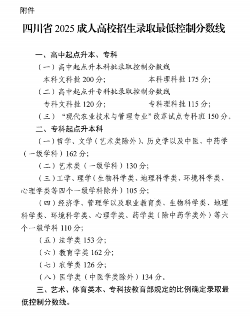 附:四川省2025年成人高校招生录取最低控制分数线