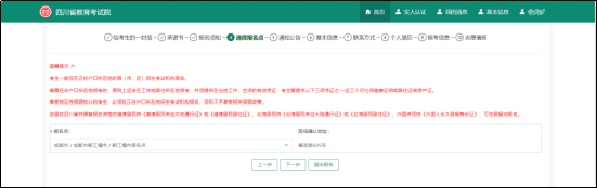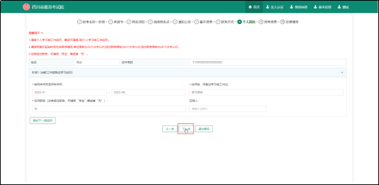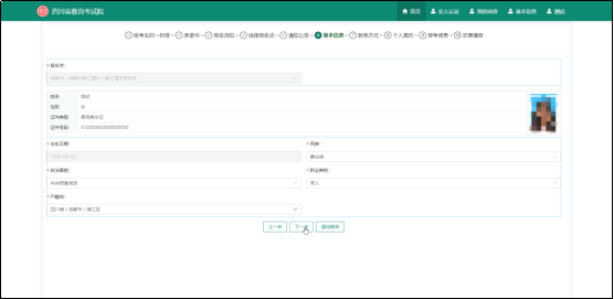 姓名、证件号、报名点等信息已经在系统显示,考生需填写其他信息,包括民族、户籍地、政治面貌、民族、职业类别等。填写完成后点击下一步。