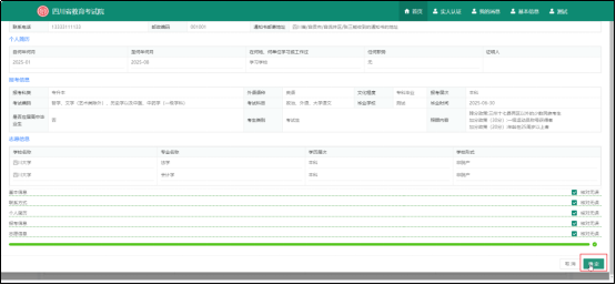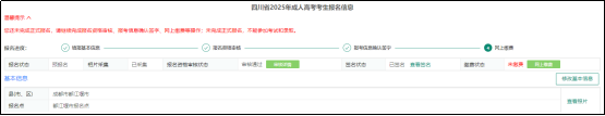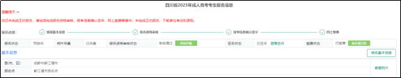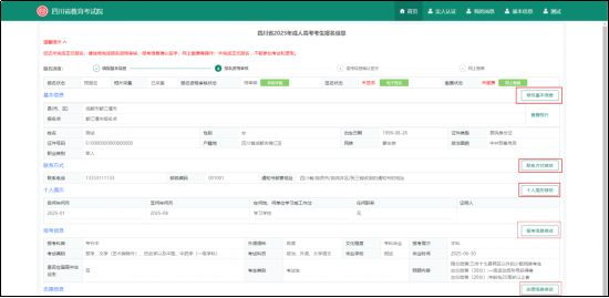 填写完成后,可在首页点击成人高考,点击“考生报名”后,考生可以在此页面查看您填写的信息,若信息有误,可以点击每栏对应的修改按钮进行修改。