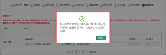 志愿信息填写完毕后,点击“保存并提交”按钮,若弹出以下弹框则证明,报名信息提交成功。