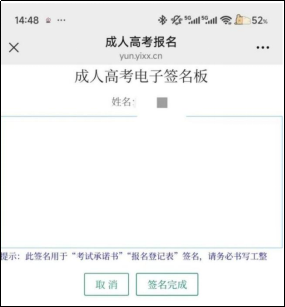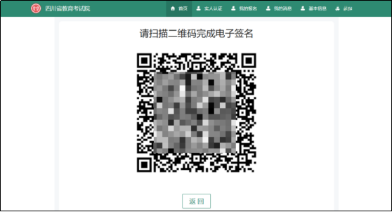 考生签名前须再次核对信息,并勾选“核对无误”后再点击最下方“确定”,弹出签字二维码,考生扫描二维码进行电子签名。