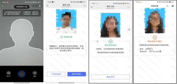 (3)采集照片与公安进行人脸比对,比对成功即完成实人认证,如果三次人脸核验不通过的考生或使用非居民身份证的考生,需至现场进行人工审核。