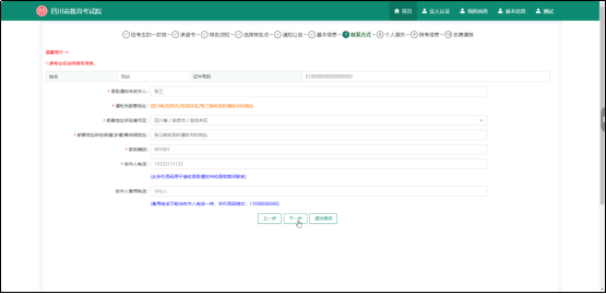 考生需要在此页面填写考生通知书的收件信息,确保您的收件人地址及电话可用,保证通知书能顺利送达,填写完成后,确认信息无误点击进入下一步。