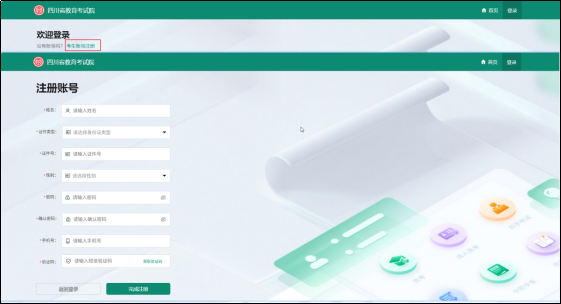 (1)所有考生都需进行注册,在注册界面输入您的基本信息,选择证件类型、输入对应的证件号码、密码、性别。